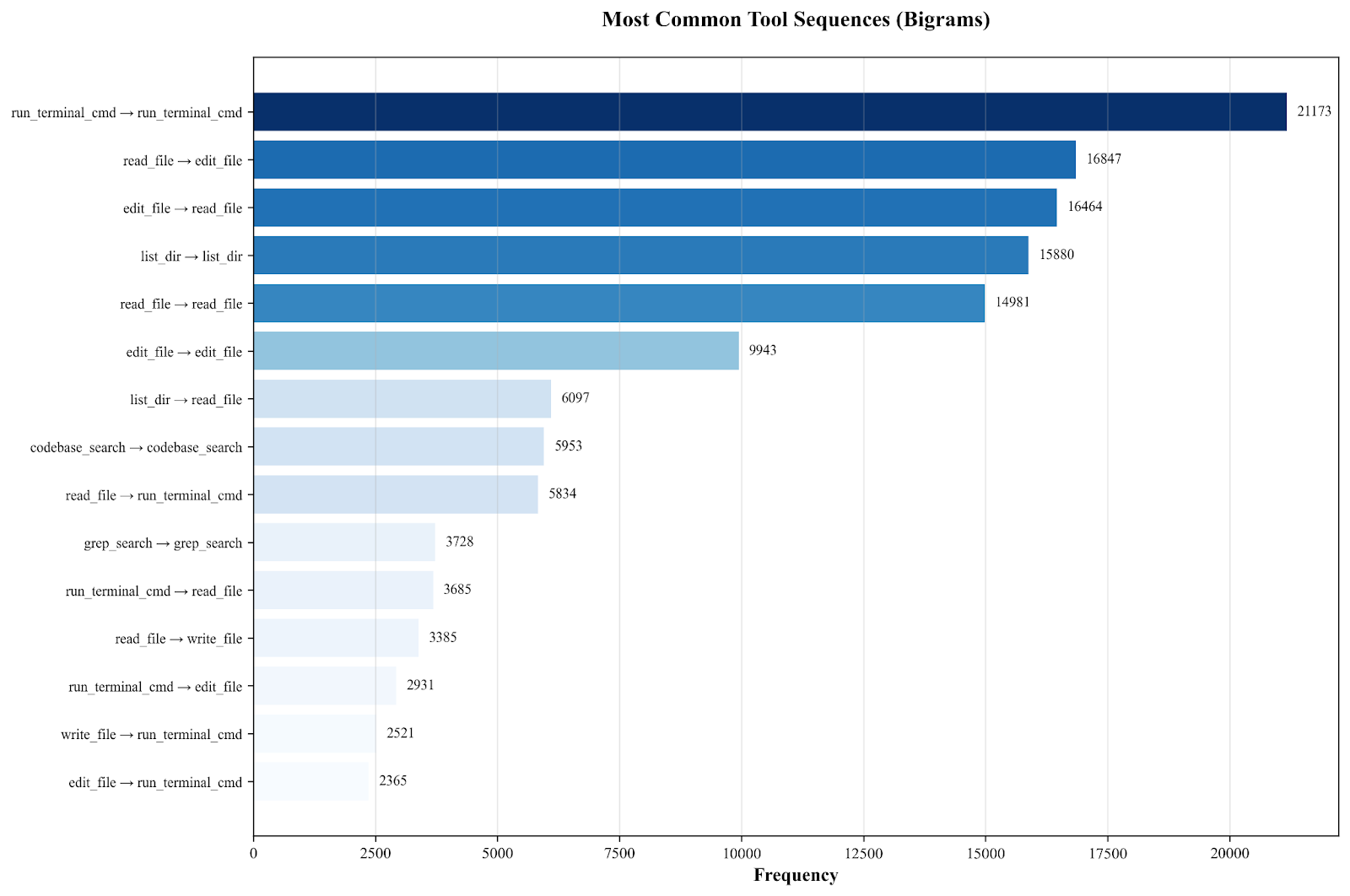 Tool usage is self-chaining. Search and execution tools self-chain at high rates, reflecting refinement loops: codebase_search→codebase_search 81.5%, run_terminal_cmd→run_terminal_cmd 66.2%, list_dir→list_dir 63.1%, grep_search→grep_search 59.3%.