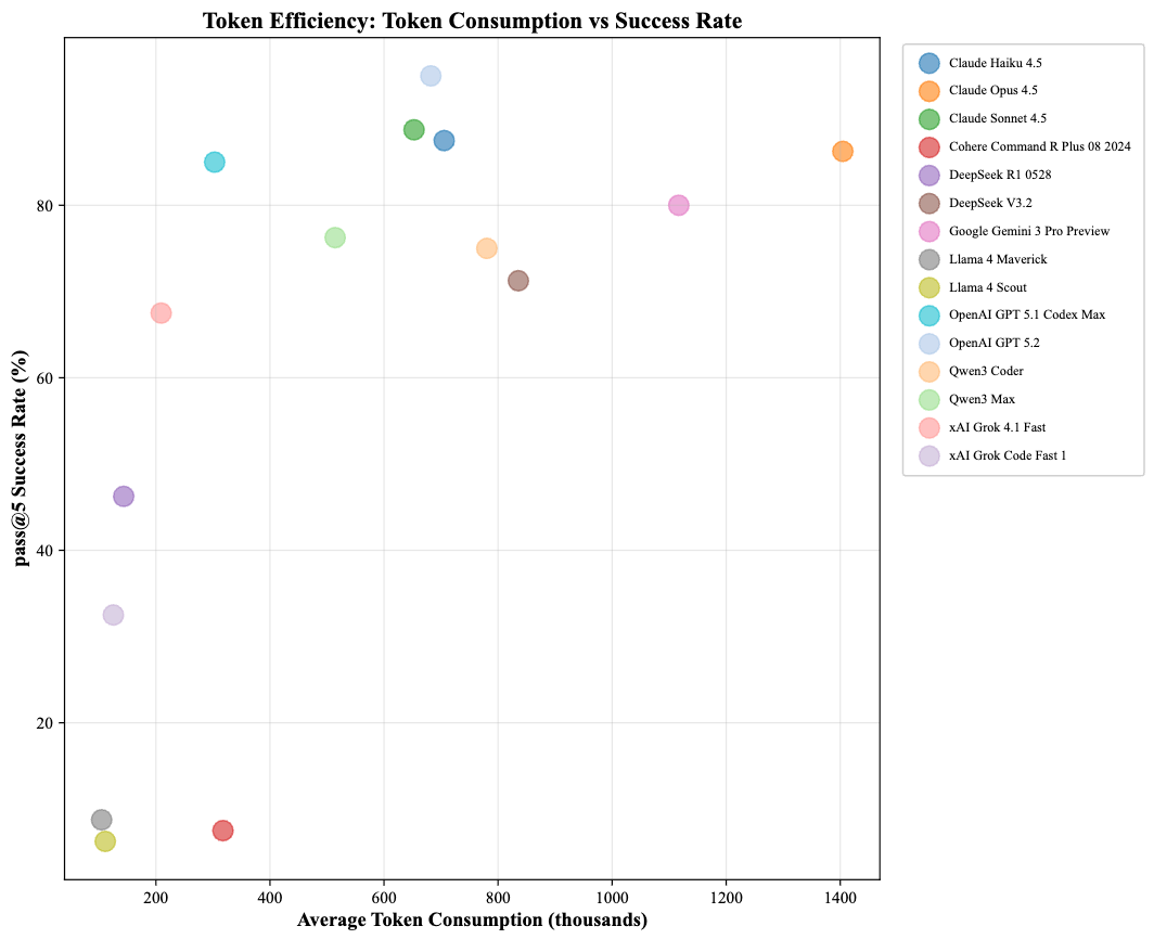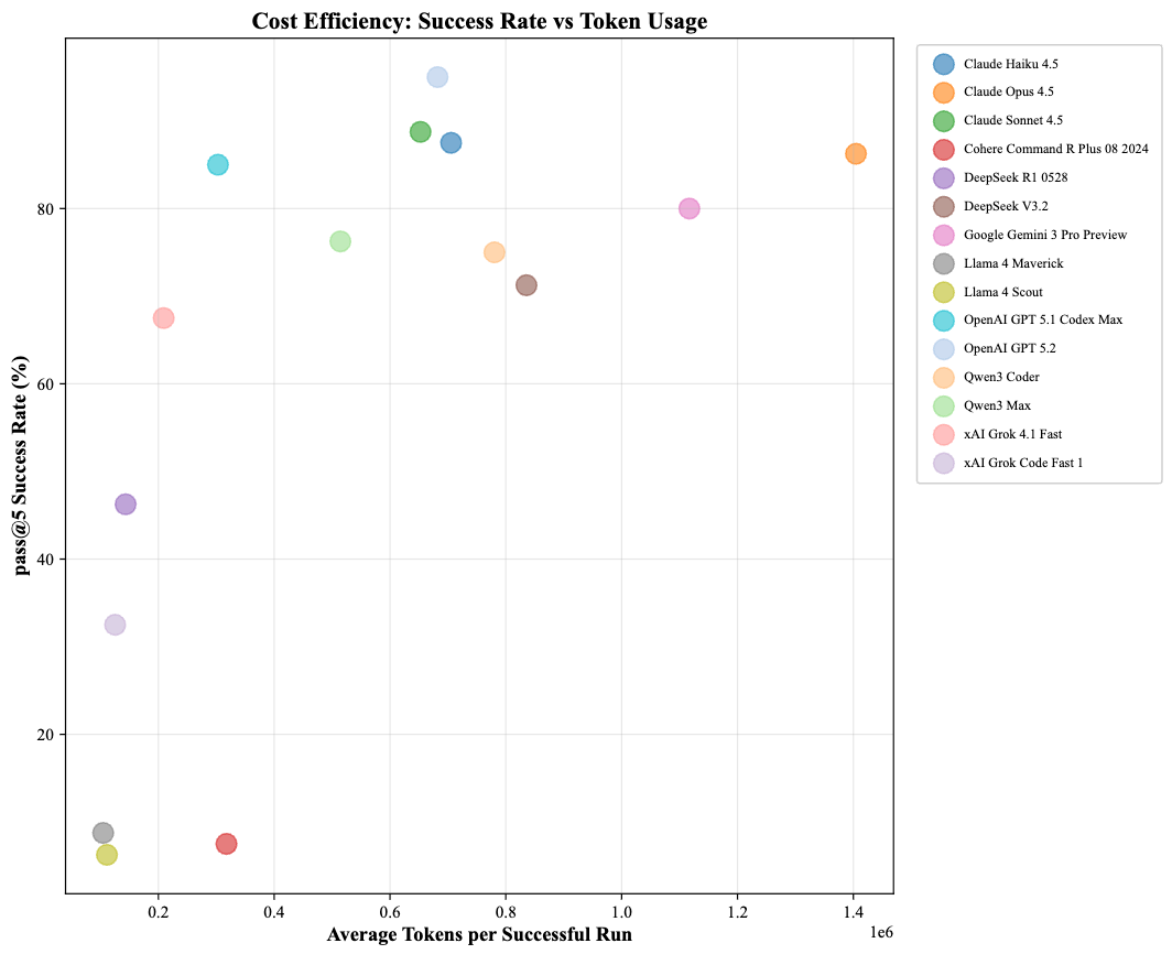 Success rate and computational cost do not necessarily correlate: Grok 4.1 Fast is the most token-efficient model (67.50% pass@5 at 182k tokens per success; efficiency 0.37), while Claude Opus achieves strong coverage (86.25%) but at a much higher cost (1,354k tokens per success).