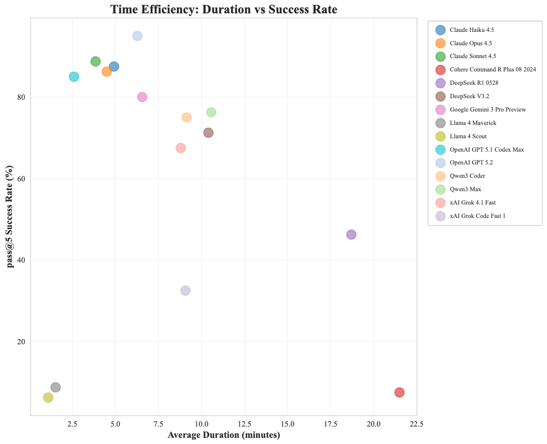 - →Production-Ready Threshold (85% pass@5). Our retry benefit analysis reveals a natural threshold at 85% pass@5 that separates production-ready models from those requiring multiple attempts. Models above this threshold (GPT 5.2 at 95%, Claude Sonnet at 88.75%, Claude Haiku at 87.50%, Claude Opus at 86.25%, GPT 5.1 Codex Max at 85%) show minimal gains between pass@1 and pass@5 (1.25–11.25 points), indicating stable, first-attempt success. Models below 85% exhibit dramatically higher retry bene- Fits, DeepSeek V3.2 gains 40 points (31.25% →71.25%), Grok 4.1 Fast gains 32.5 points (35% →67.5%), reflect- ing inconsistent, iteration-dependent behavior unsuitable for production where developers expect deterministic results.